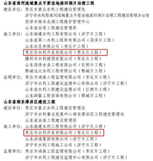 2021年4月19日,山東省水利廳網站公示了全省重點水利工程“爭進度、賽質量、比擔當”決勝攻堅勞動競賽擬獲獎名單。棗莊市水利開發有限公司榮獲先進集體獎項(嶧城區陰平沙河前張閘除險加固工程項目經理部)、文明工地獎項3個(棗莊市市中區稅郭支流東王莊閘除險加固工程、山東省淮河流域重點平原洼地南四湖片治理工程、山東省湖東滯洪區建設工程)、QC小組成果獎項(東王莊閘閘壩閘室段混凝土施工QC小組)、優秀個人獎項(高級工程師連永)。
