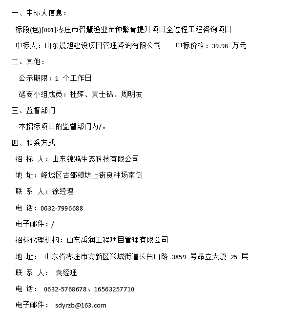 棗莊市智慧漁業(yè)苗種繁育提升項目全過程工程咨詢項目 成交公示